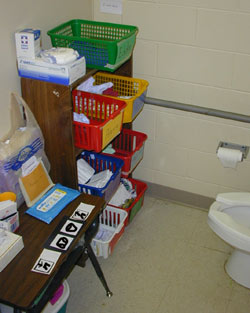 A table and labeled baskets help organize children's extra clothes and diapers. Picture cards that show the toileting sequence are posted above the toilet