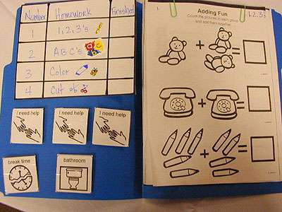 This is an example of a school work communication folder. All the information that is needed to get the task done is organized and listed here. Handy for homework and classroom work. Communication folders are wonderful for building independence.