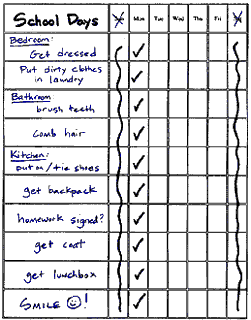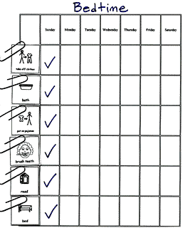 Using vertical grids, activities are checked off as completed and the schedule can be used for a week at a time. Grids can also hold more complex written information for more advanced readers. Blank weekly schedule grids are available in the forms section of the site.